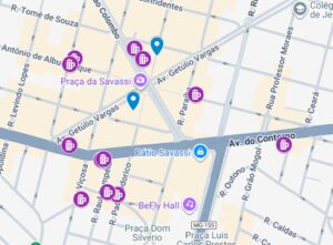 Todos os bares escolhidos para o trajeto de sábado ficam na Savassi. Mas pra te ajudar vou colocar aqui um mapa da região onde ficam os bares, para que você possa triagular um lugar que fique perto o suficiente pra você se arraste pra casa depois que completar o mapa. 😂
