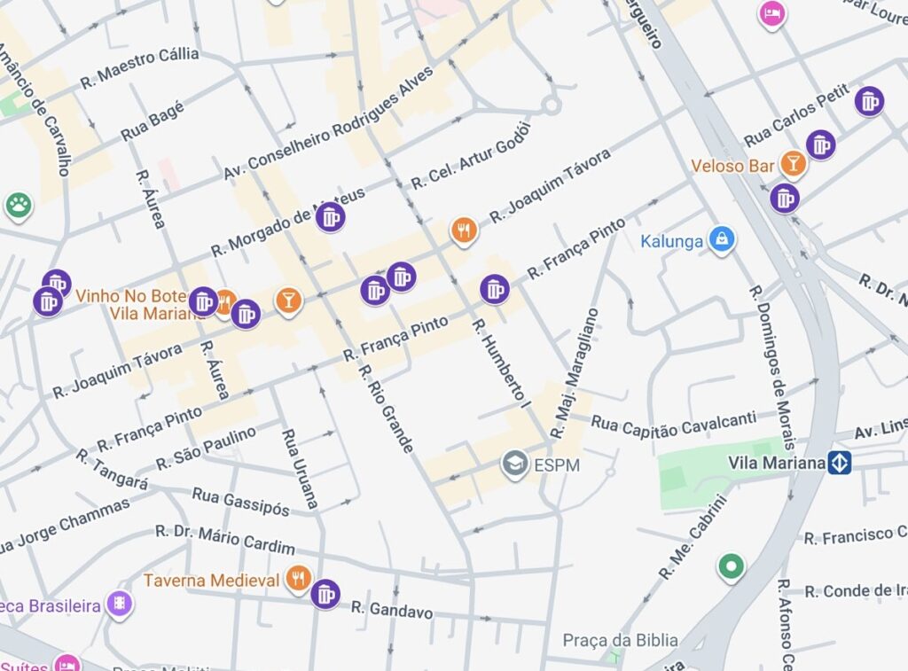 Todos os bares escolhidos para o trajeto de sábado ficam na Vila Mariana. Mas pra te ajudar vou colocar aqui um mapa da região onde ficam os bares, para que você possa triagular um lugar que fique perto o suficiente pra você se arraste pra casa depois que completar o mapa. 😂